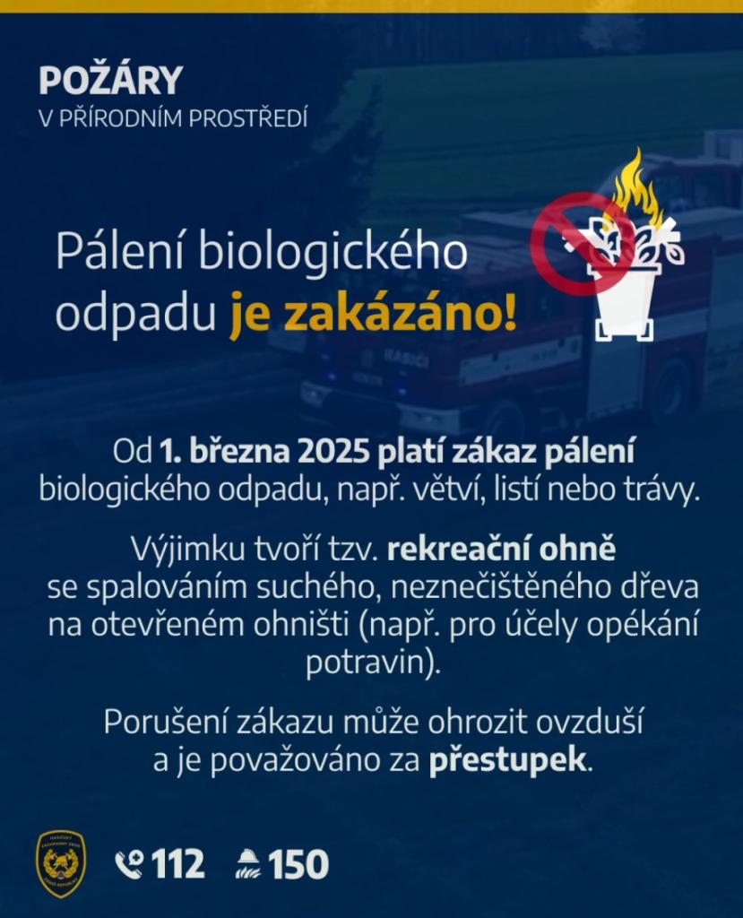 od 1. března - zákaz pálení biologického odpadu - zákaz vypalování trávy, plevelů nebo křovin